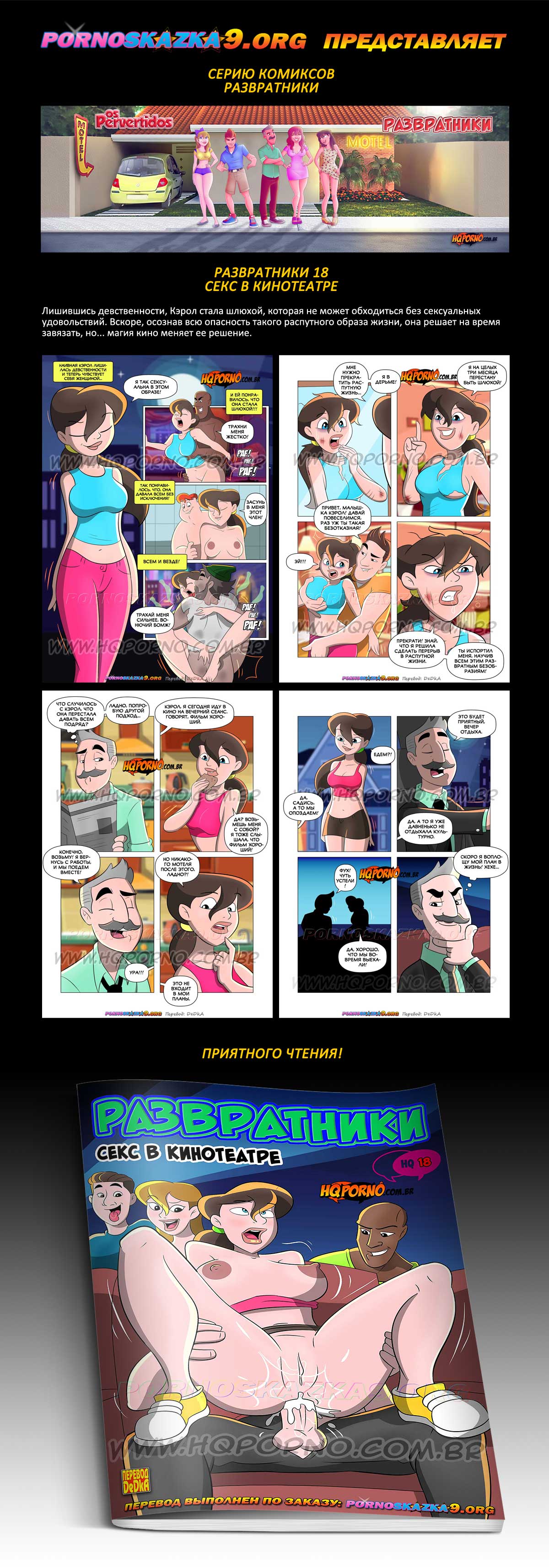 Порно комикс Развратники. Часть 18. Секс в кинотеатре. Лишившись девственности, Кэрол стала шлюхой, которая не может обходиться без сексуальных удовольствий. Вскоре, осознав всю опасность такого распутного образа жизни, она решает на время завязать, но… магия кино меняет ее решение.